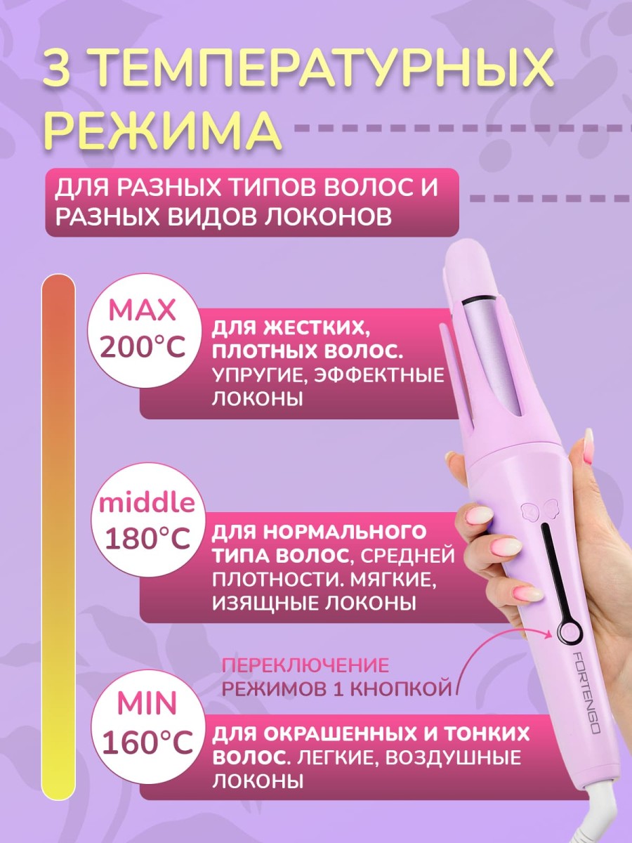Автоматическая плойка для локонов FORTENGO AUTO CURLER – это новые и безопасные технологии для ухода за волосами в домашних условиях. Они позволяют свести к минимуму микроповреждения волос от воздействия температуры, расчесывания, применения различных средств для окрашивания, укладки и стайлинга. Красивые, упругие локоны и стильная укладка с заботой о ваших волосах.
