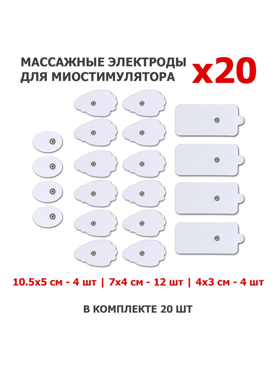 Электроды для миостимулятора EMS-120PL 10.5х5/7х4/4х3 см, 20 шт, универсальные используются как дополнительный аксессуар для массажера миостимулятора. Предназначены для многоразового применения. Гелевая липучка фиксатор электрода позволяет проводит EMS и TENS импульсы во время миостимуляции и эффективно делать массаж тела.