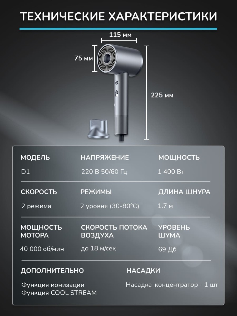 Насадка-концентратор (зауженной формы ) создает оптимальные условия для быстрой сушки и красивой укладки волос без повреждения, сохранения естественной влажности, блеска и сияния. Волосы нежные, мягкие и шелковистые.