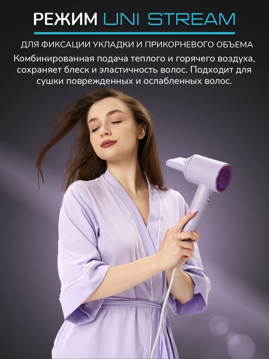 Направленный концентрированный воздушный поток с ионизацией создает оптимальные условия для быстрой сушки и красивой укладки волос без повреждения, сохранения естественной влажности, блеска и сияния. Волосы нежные, мягкие и шелковистые.