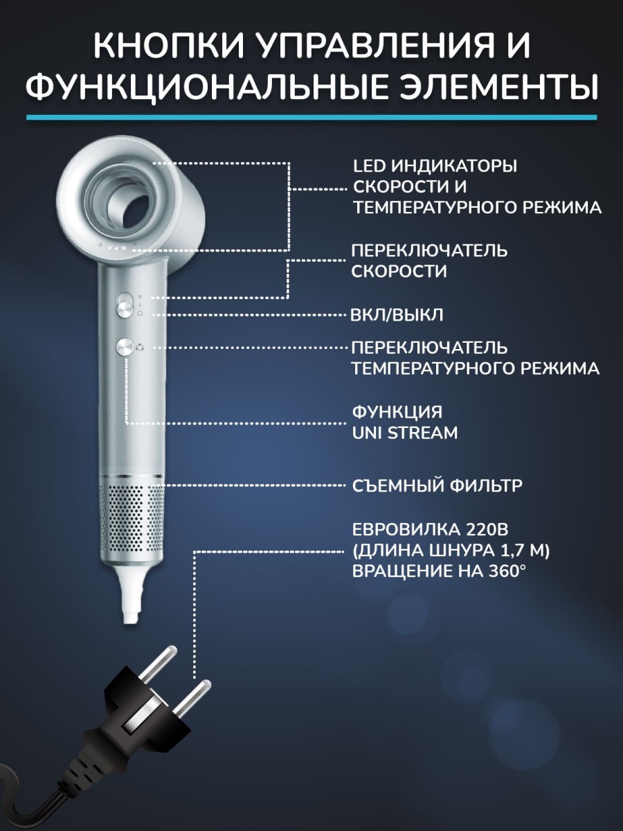 Направленный концентрированный воздушный поток с ионизацией создает оптимальные условия для быстрой сушки и красивой укладки волос без повреждения, сохранения естественной влажности, блеска и сияния. Волосы нежные, мягкие и шелковистые.