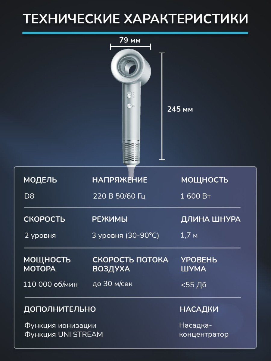 Фен FORTENGO SILVER STREAM D8 – это элегантность в деталях, оригинальный дизайн, незабываемый цвет. Лаконичный и изысканный, профессиональный помощник -всегда у Вас под рукой!