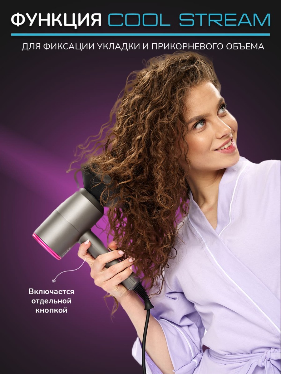 Функция COOL STREAM предназначена для фиксации прически, создания прикорневого объема и придания блеска волосам. Обычно ее используют в конце сушки и укладки.