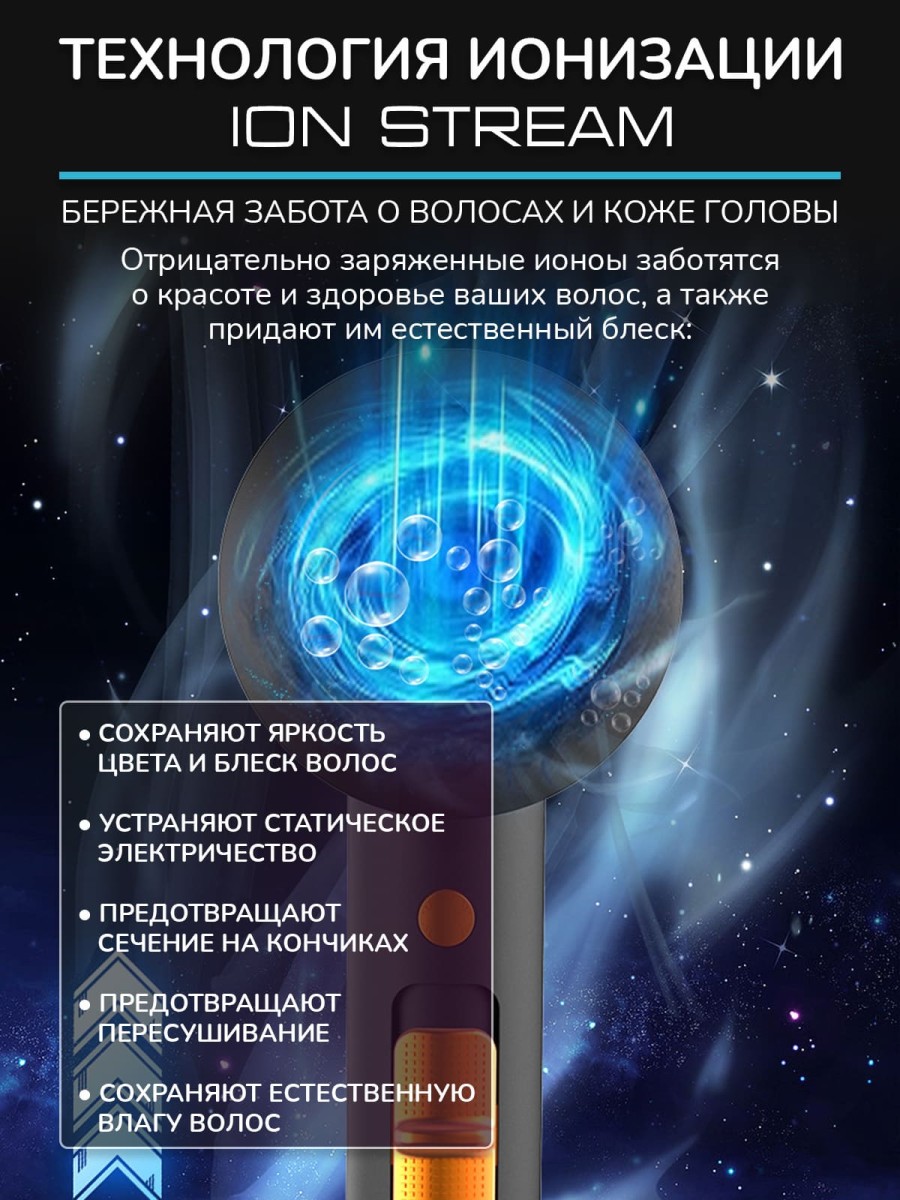Ионизация. Сила ионов воздушного потока нейтрализует статическое притяжение, защищает волосы от перегрева, повреждения, вредного воздействия, уменьшает их сухость и ломкость, поддерживает естественную увлажненность и эластичность.