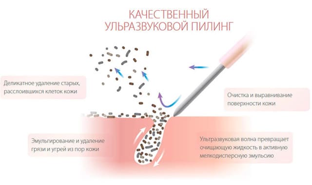Под воздействием ультразвуковых волн происходит пилинг лица, удаляются ороговевшие, «мертвые» клетки с поверхности кожи. Поверхностные слои эпидермиса очищаются и выравниваются. Удаляются избытки кожного сала, черные точки, очищаются поры. Благодаря этому ультразвуковые колебания проникают в глубокие слои тканей и запускают процессы регенерации и обновления клеток. Кожа насыщается кислородом. Выравнивается ее тон и цвет, она становится ровной, гладкой, красивой.