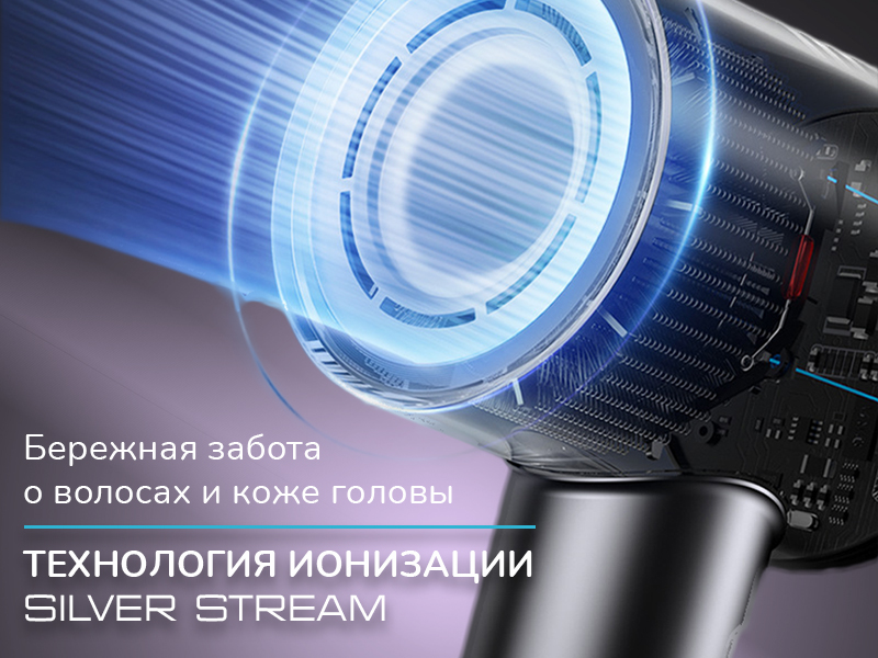 К тому же сильный воздушный поток большой скорости позволяет использовать невысокие температуры для быстрой сушки волос, при этом сохраняя не только их здоровый и привлекательный внешний вид, но и не вызывая раздражения при чувствительной коже головы.