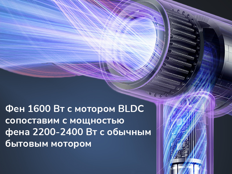 Цифровой BLDC мотор (новое поколение) оснащен защитой от перегрева. Обеспечивает продолжительную работу фена и его отличную мощность. Широкий температурный диапазон. Холодный обдув или комбинированная подача воздуха. Быстрая и бережная сушка волос. Позволяет моделировать укладки различного уровня сложности Минимальный уровень шума и вибрации. Отличное преимущество: низкое потребление электроэнергии при высокой мощности мотора. Применяется в профессиональных приборах и фенах премиального качества для домашнего использования.