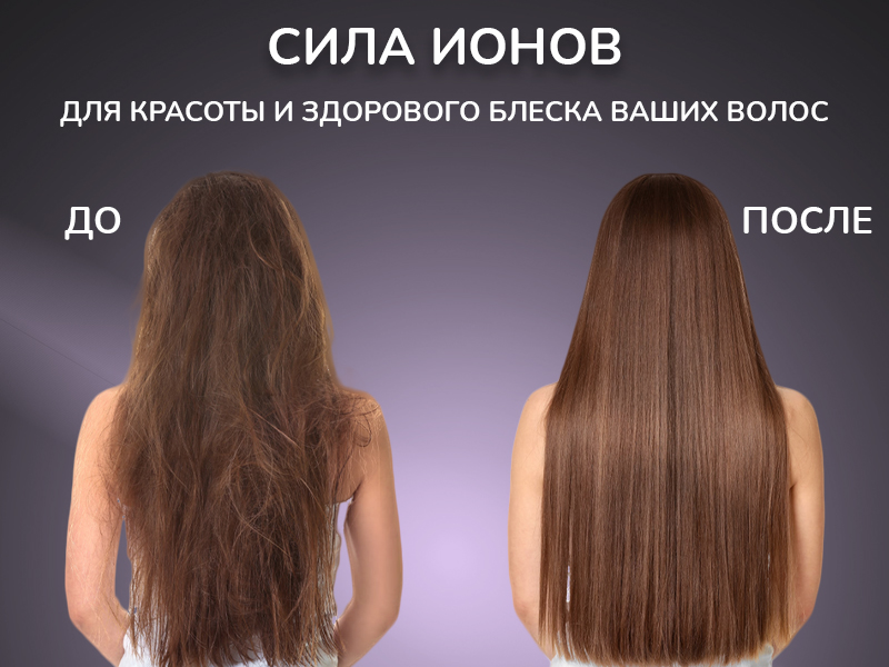 Ионизация отрицательными ионами нейтрализуя положительный заряд волос, закрывает фолликулы, восстанавливает их структуру, сохраняет естественную влагу, делает гладкими и шелковистыми, дарит волосам блеск, надолго сохраняет цвет.
