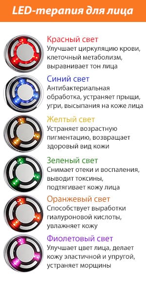 Инновационная LED-технология и разработка последнего поколения для лица. Применяются шесть световых волн разного цвета: красного, синего, желтого, зеленого, оранжевого и фиолетового. Каждый свет имеет свою длину волны, которая проникает на определенную глубину в клетки и ткани, запускает процессы восстановления и омоложения как в эпидермисе, так и в дерме, восстанавливает кровообращение и лимфодренаж.