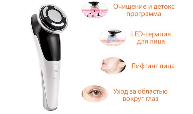 - Функциональность: 5 в 1. Такие приборы имеют все необходимые функции и методы для комплексного ухода и омоложения кожи лица. В них есть деликатный прогрев тканей, ультразвуковой пилинг, LED свет, EMS массаж, уход за областью глаз, фонофорез.