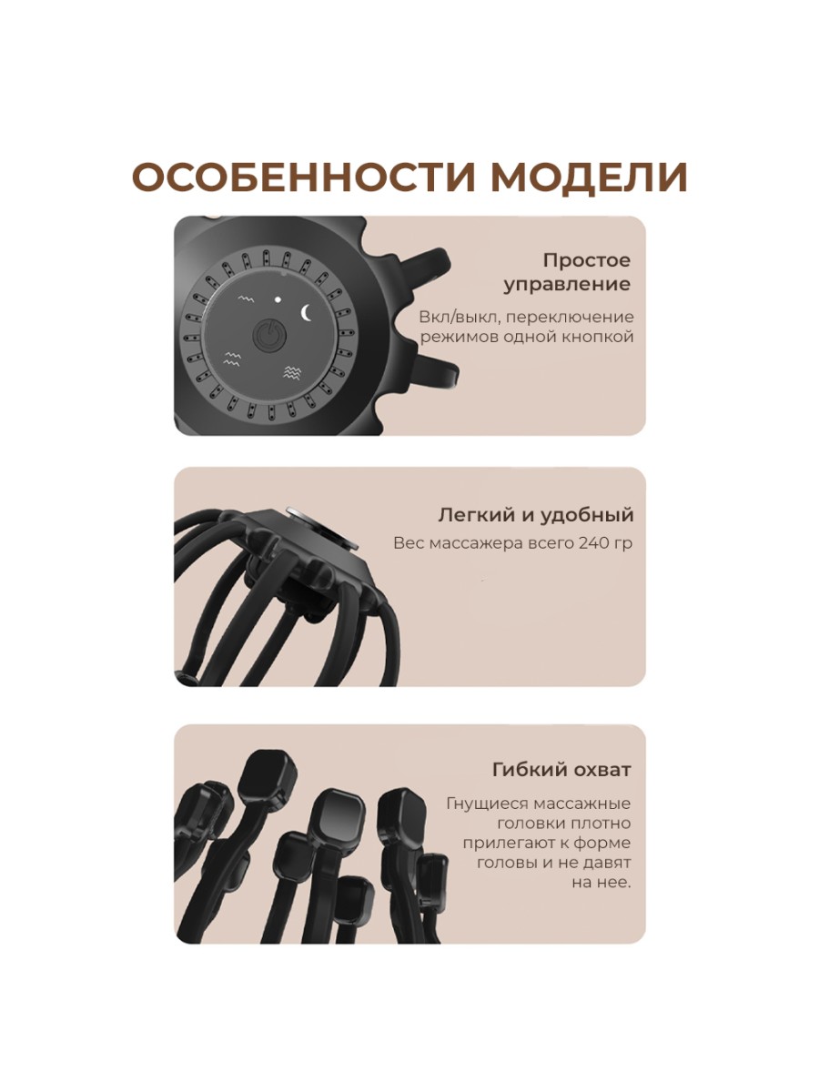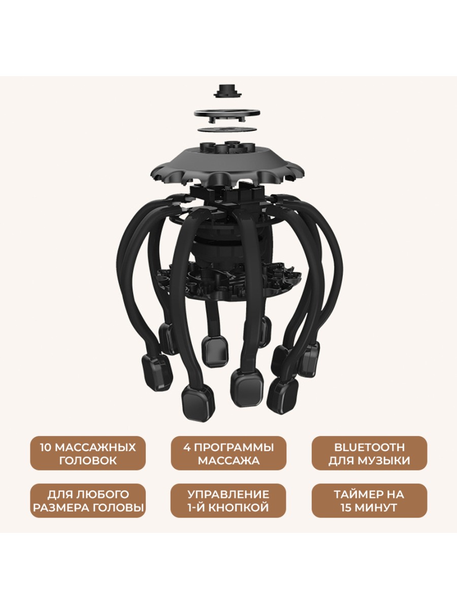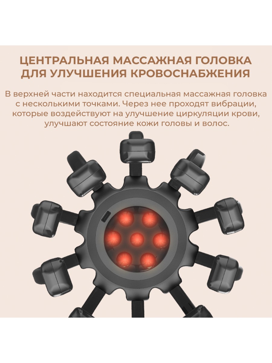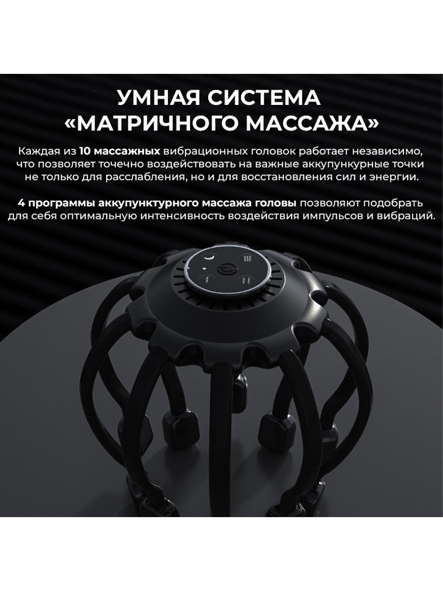 - 10 независимых массажных вибрационных головок, которые деликатно воздействуют на все важные биологически активные точки, расположенные по окружности головы.
