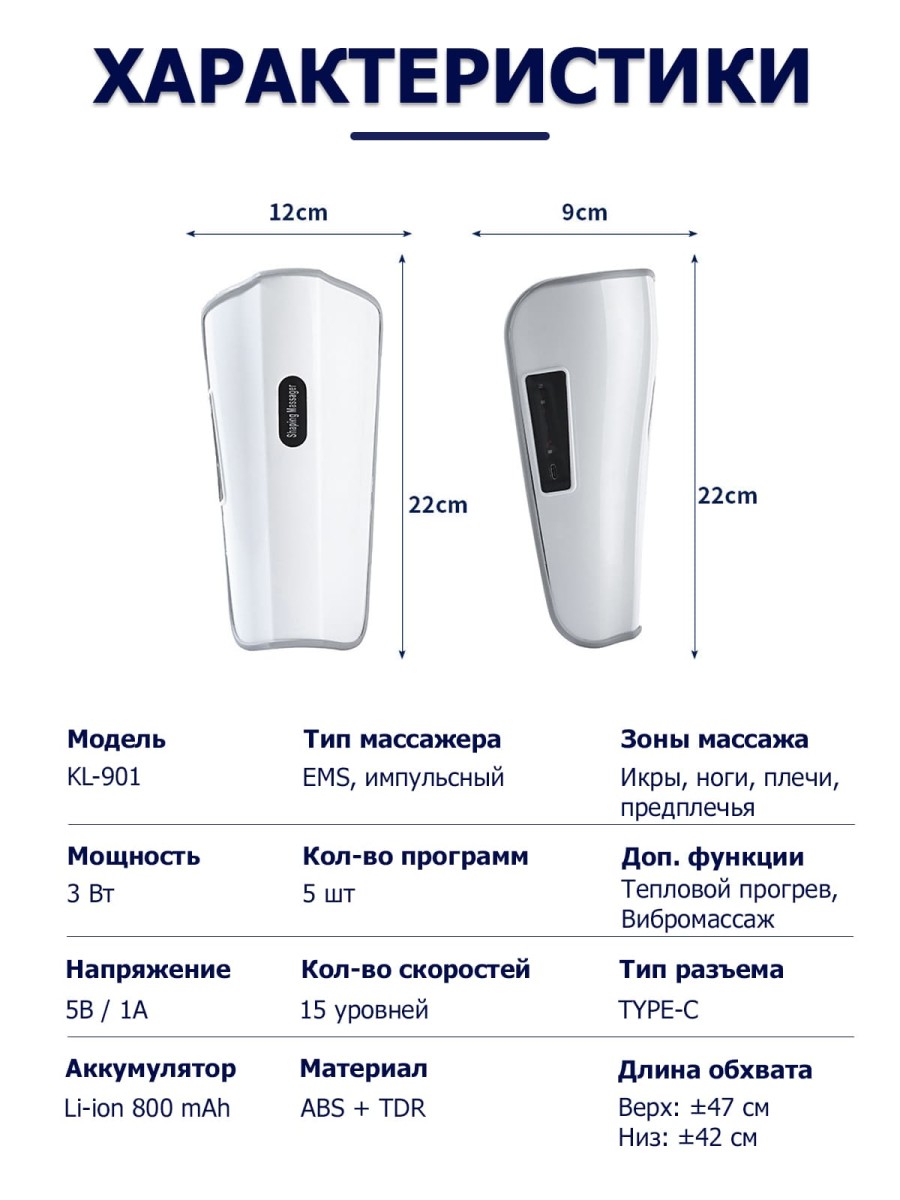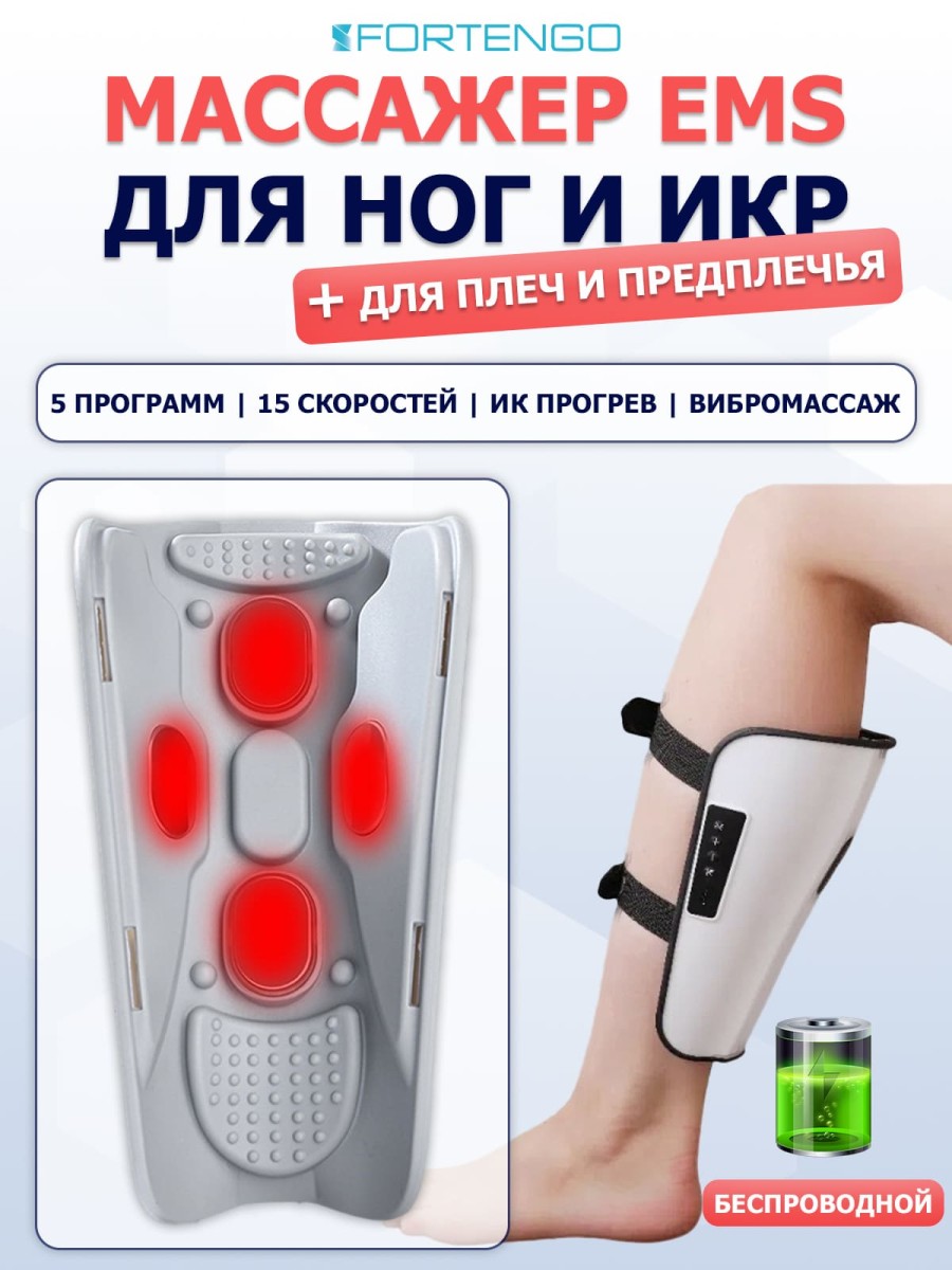 Массажер для ног и икр электрический FORTENGO KL-901, 5 программ, EMS, прогрев и вибромассаж, белый используется для массажа икр и ног, устранения судорог, мышечной боли и напряжения, отеков, тяжести в ногах. Дополнительно может применяться для массажа плеч и предплечья при болях и «туннельном синдроме».