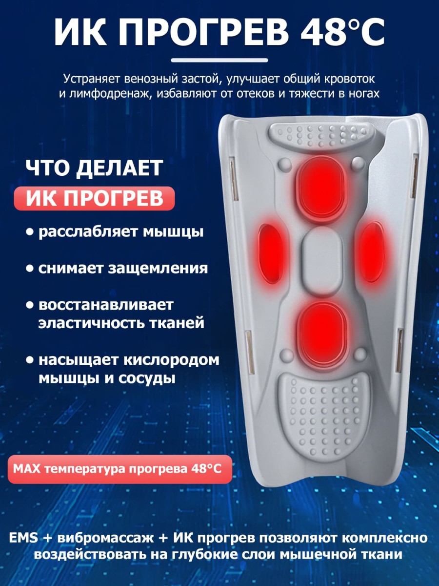 EMS импульсный массаж+ инфракрасный прогрев= усиливают расслабляющий релакс-эффект, помогают быстро избавиться от усталости и тяжести в ногах после рабочего дня. Комфортное тепло и массаж микротоками стимулируют кровообращение, активизируют лимфодренаж, устраняют отеки.