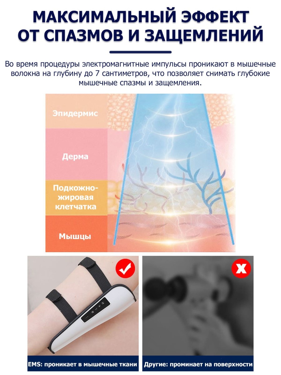 - Импульсный EMS массаж снимает защемления, напряжение, боль, устраняет судороги