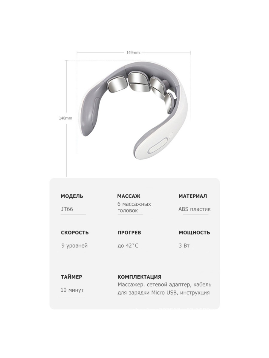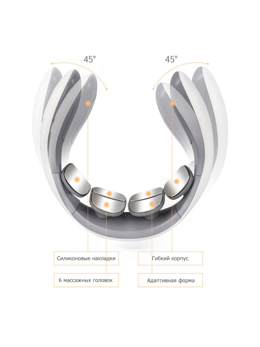 - 6 магнитных массажных адаптивных головок на гибком корпусе прибора увеличивают область массажа, воздействуют на все важные биологически активные точки, расположенные в области шеи и воротниковой зоны, помогают быстро и эффективно избавиться от боли, спазмов и защемлений.