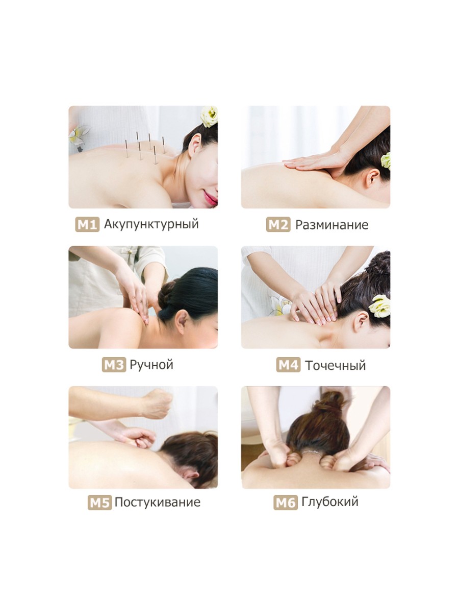 - 6 программ: постукивание, разминание, акупунктурный, точечный, ручной, глубокий; поэтому Вы всегда сможет выбрать наиболее комфортную и эффективную массажную программу для себя.