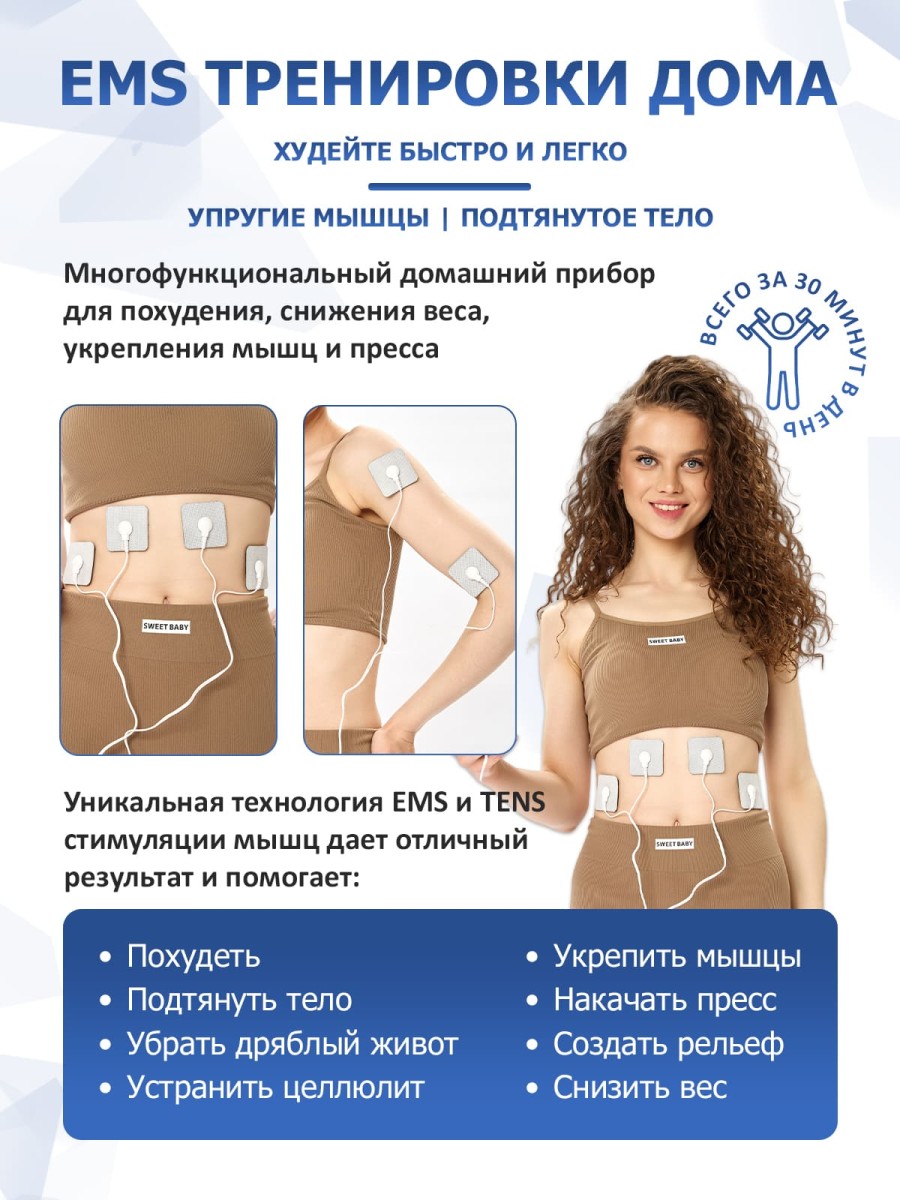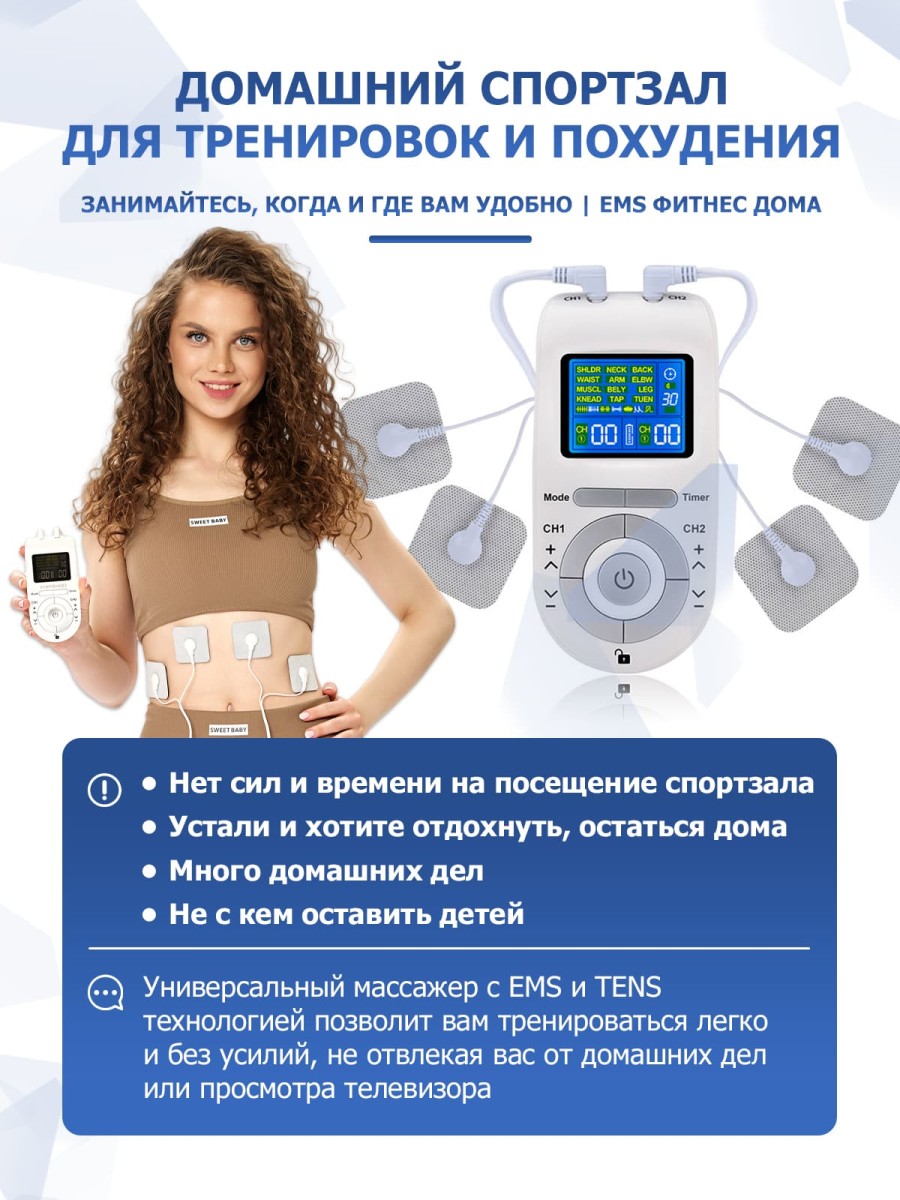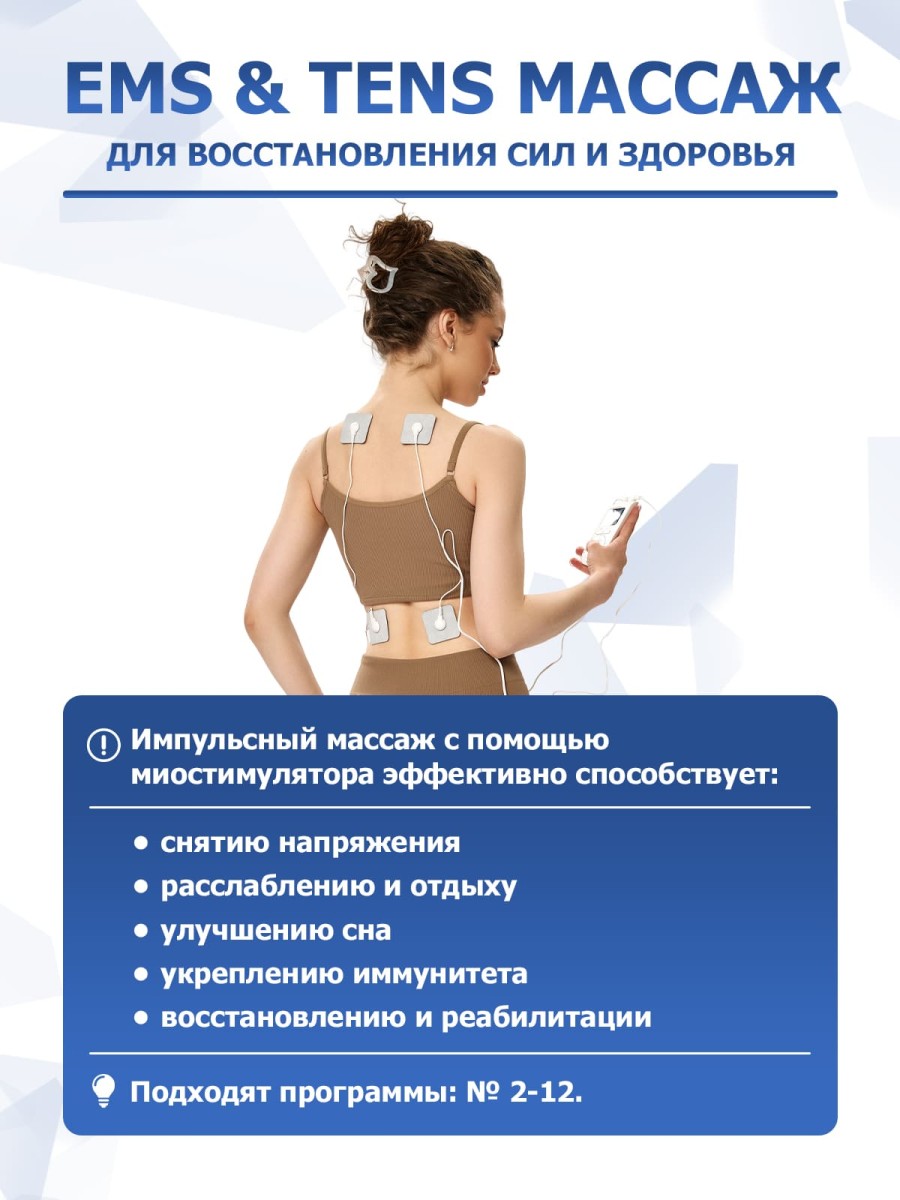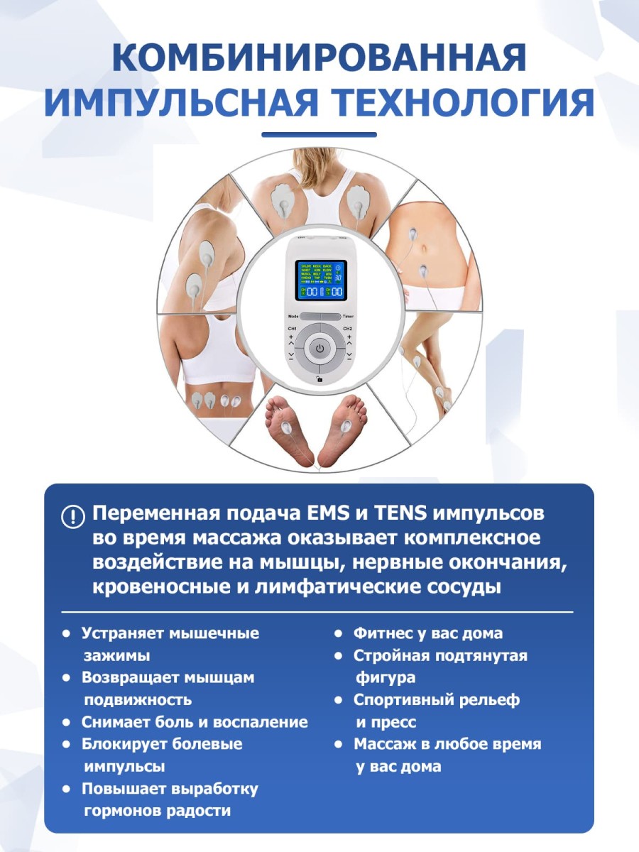 | Дополнительные функции | автоматическое распределение EMS и TENS импульсов в зависимости от программы |