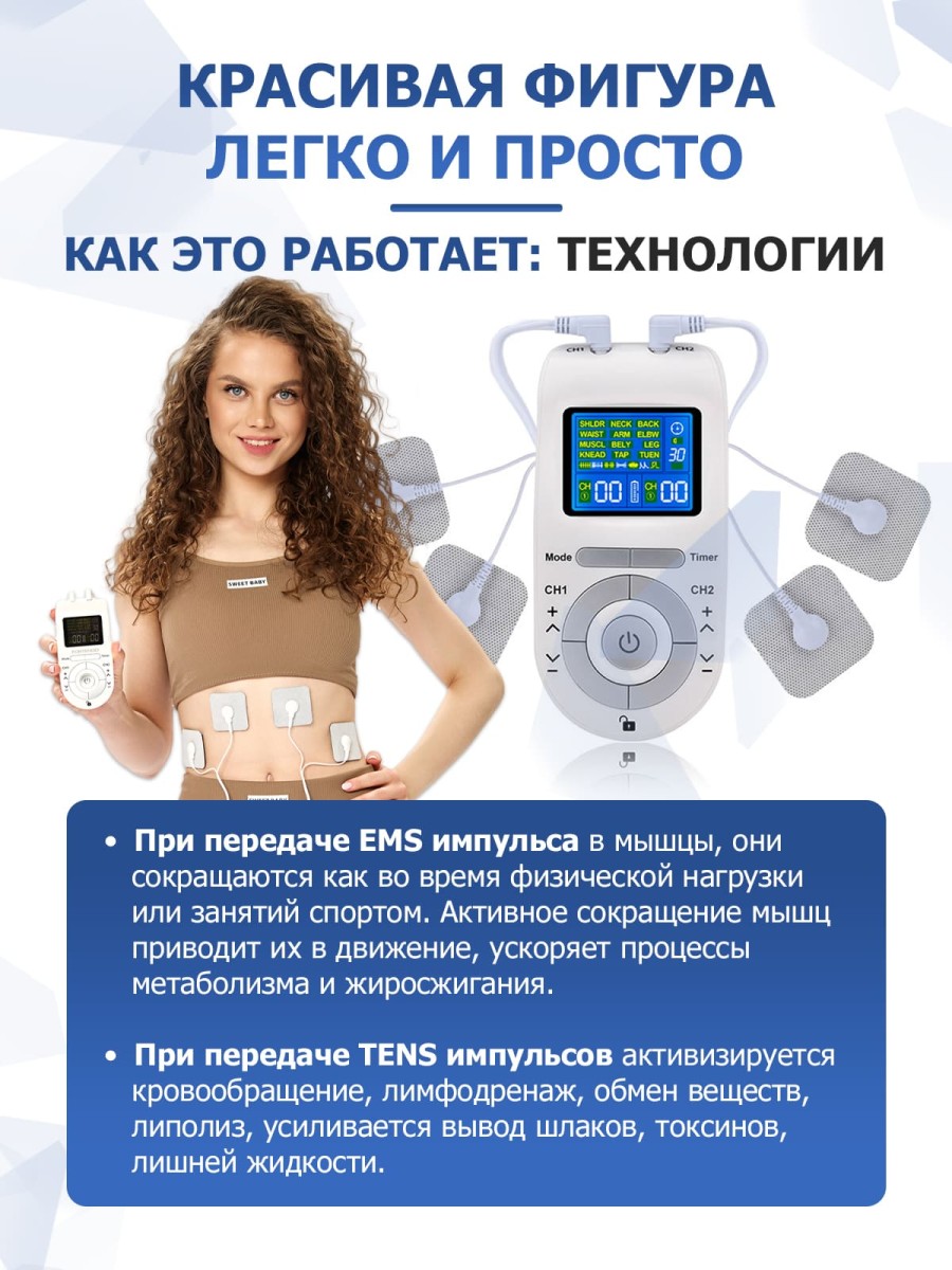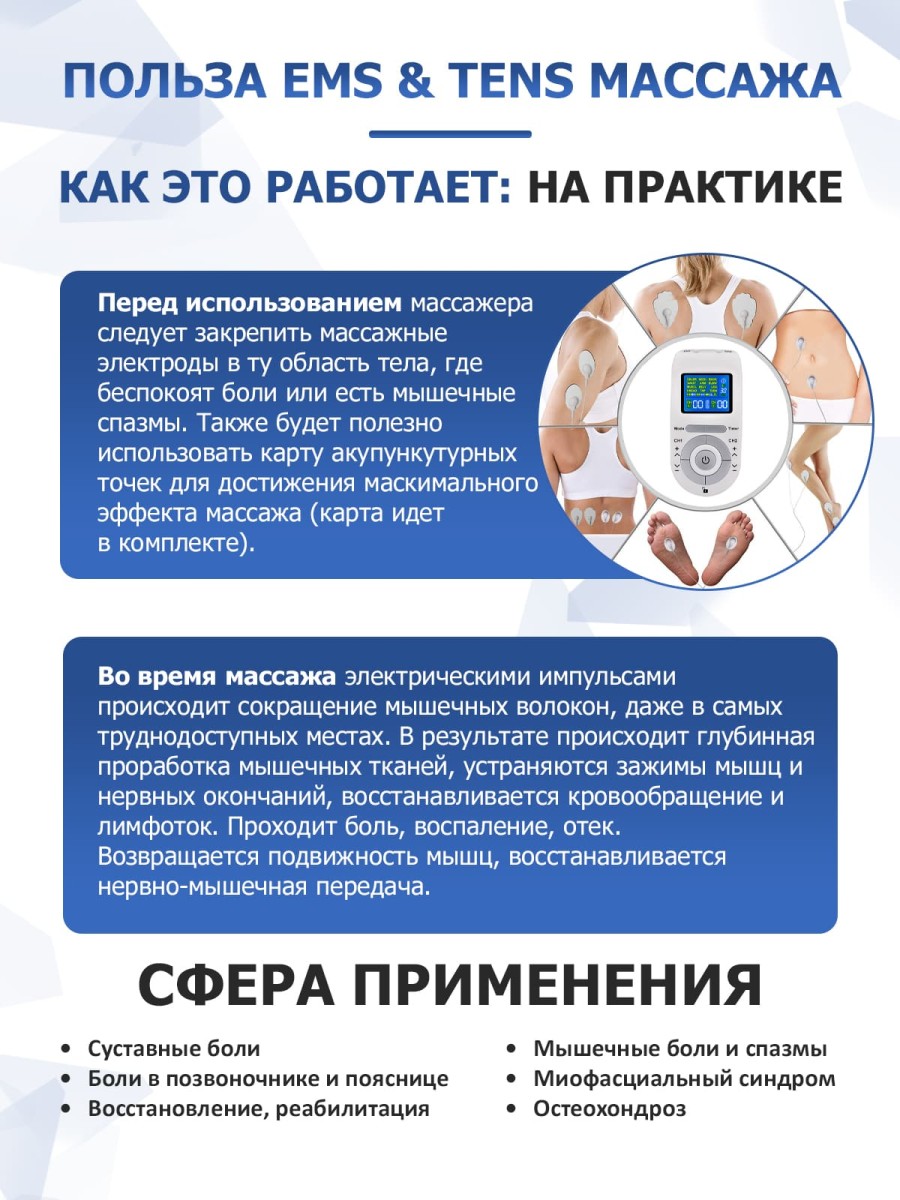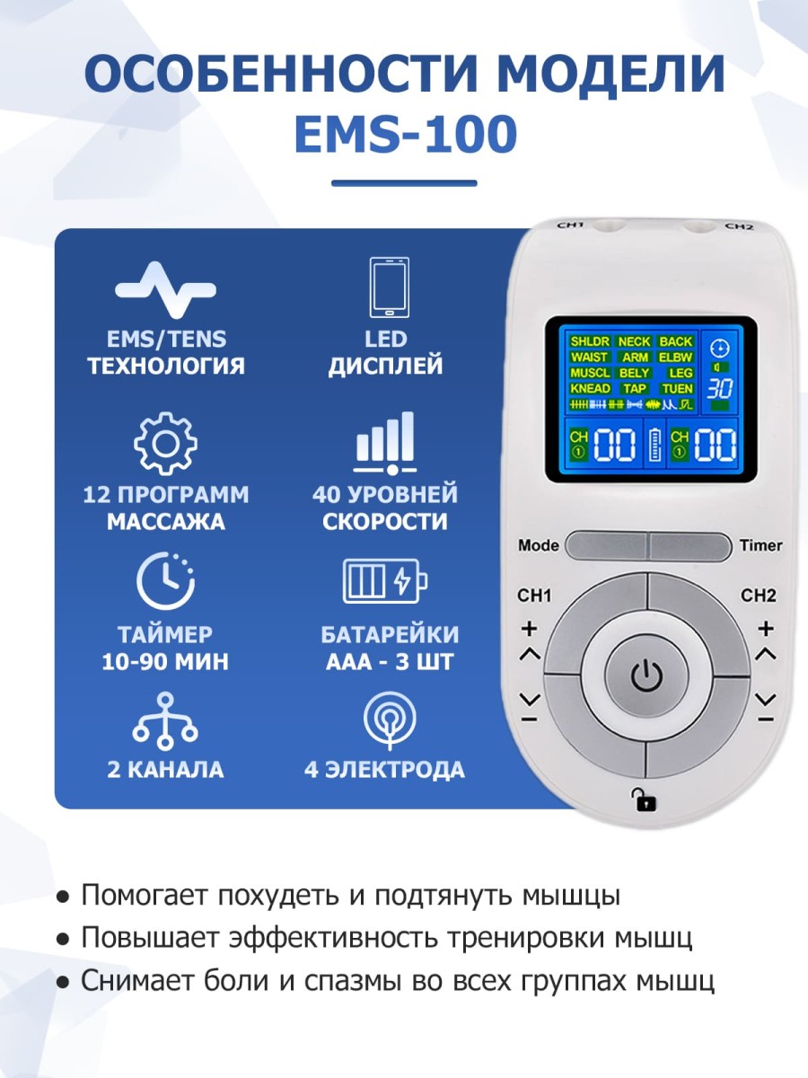 Действие массажера миостимулятора EMS TENS для тела EMS-100 основано на новейших массажных технологиях: