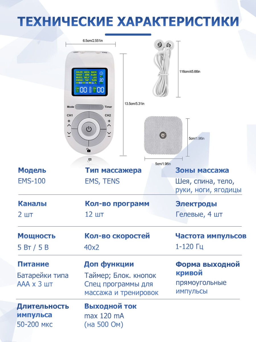 | Вид массажа | EMS/TENS, импульсный |