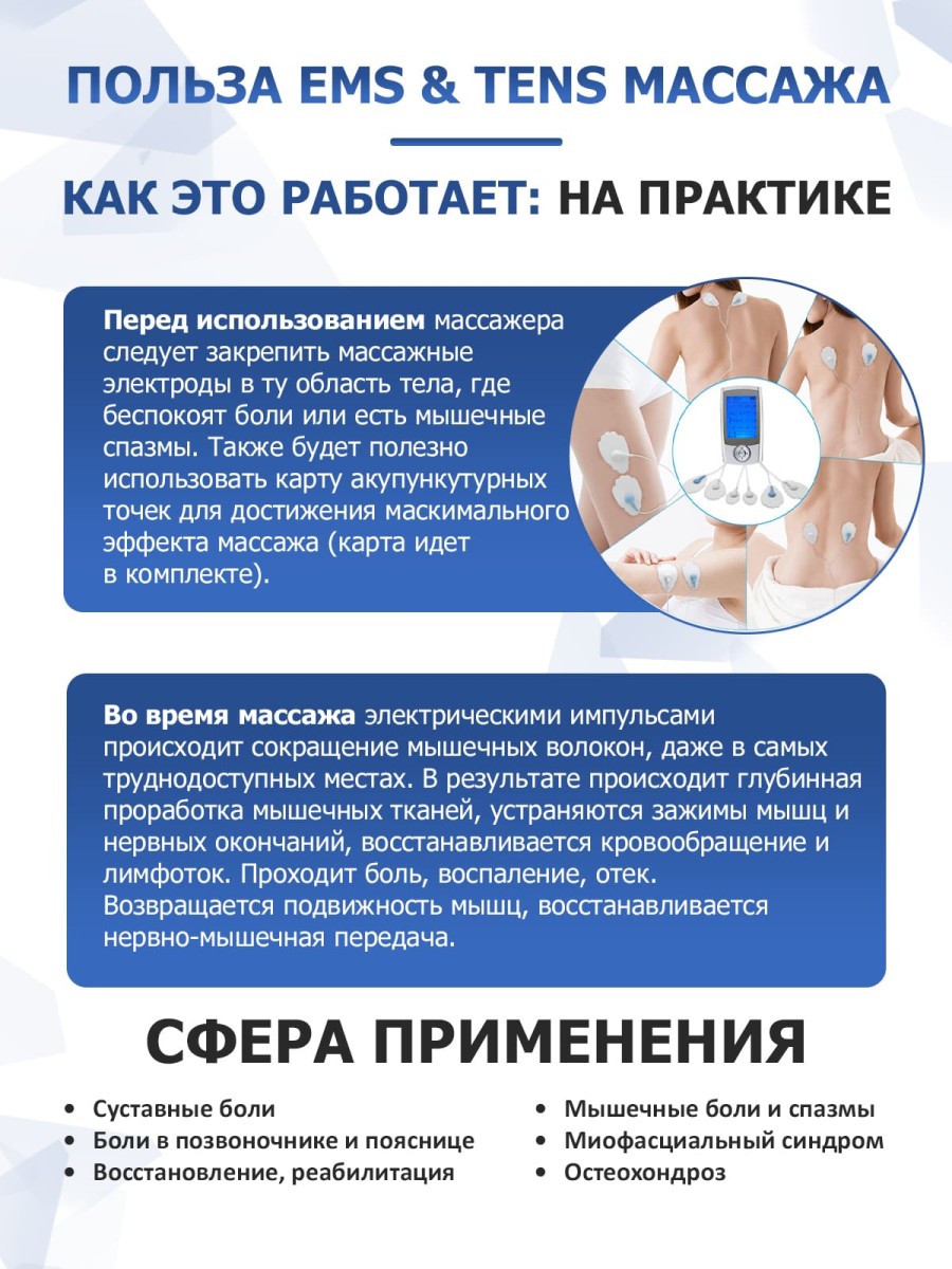 Многофункциональный массажер миостимулятор эффективен против различных видов боли, остеохондроза, защемления мышц и нервных окончаний, помогает восстановить кровообращение, укрепить мышцы и обрести фигуру своей мечты без изнурительных диет и ежедневных тренировок.