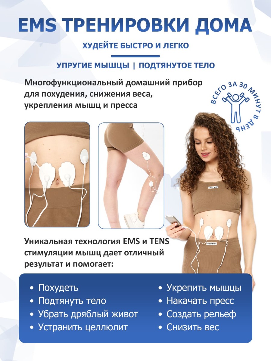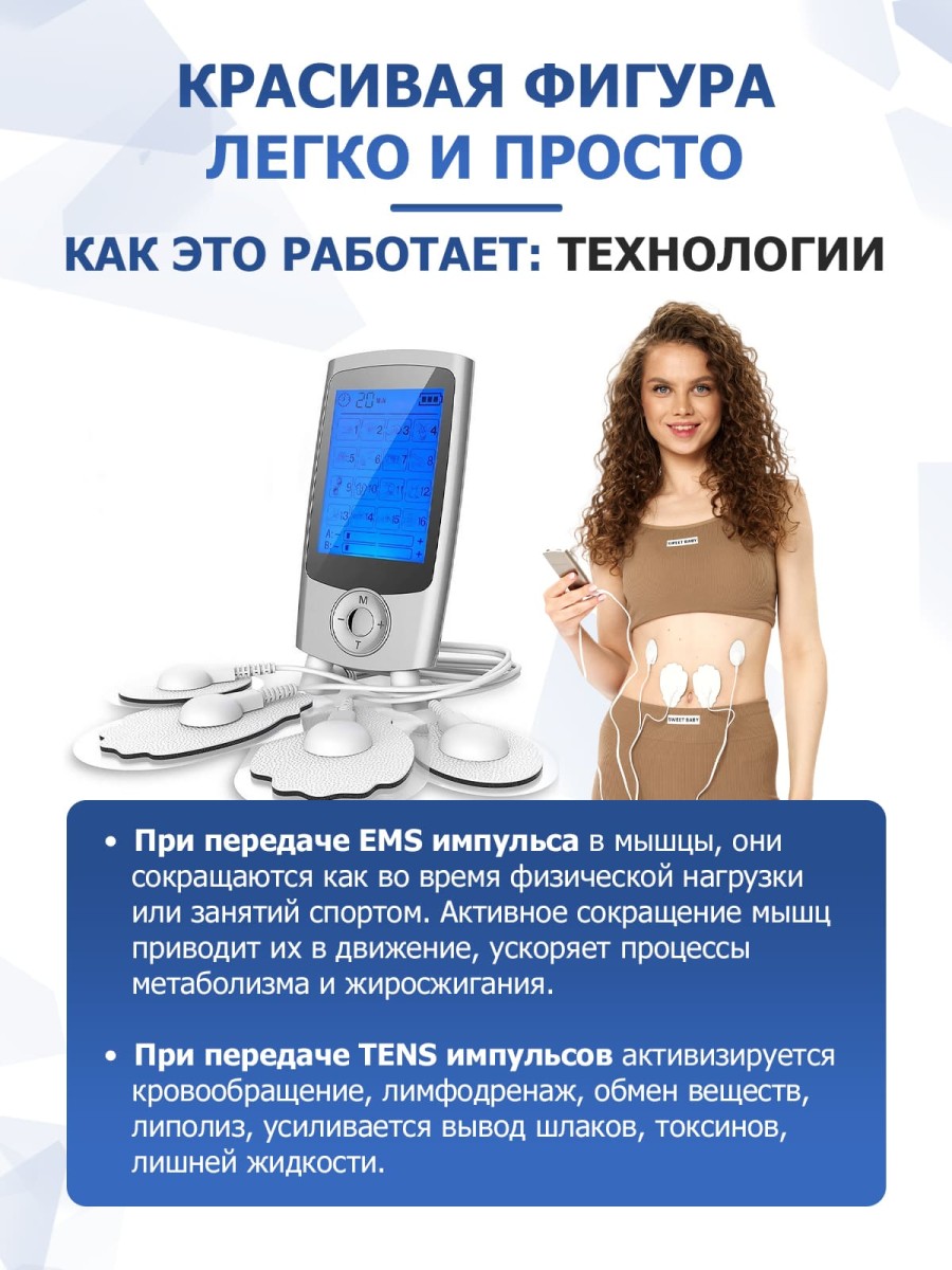 | Дополнительные функции | автоматическое распределение EMS и TENS импульсов в зависимости от программы |