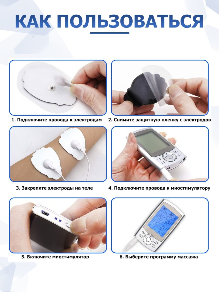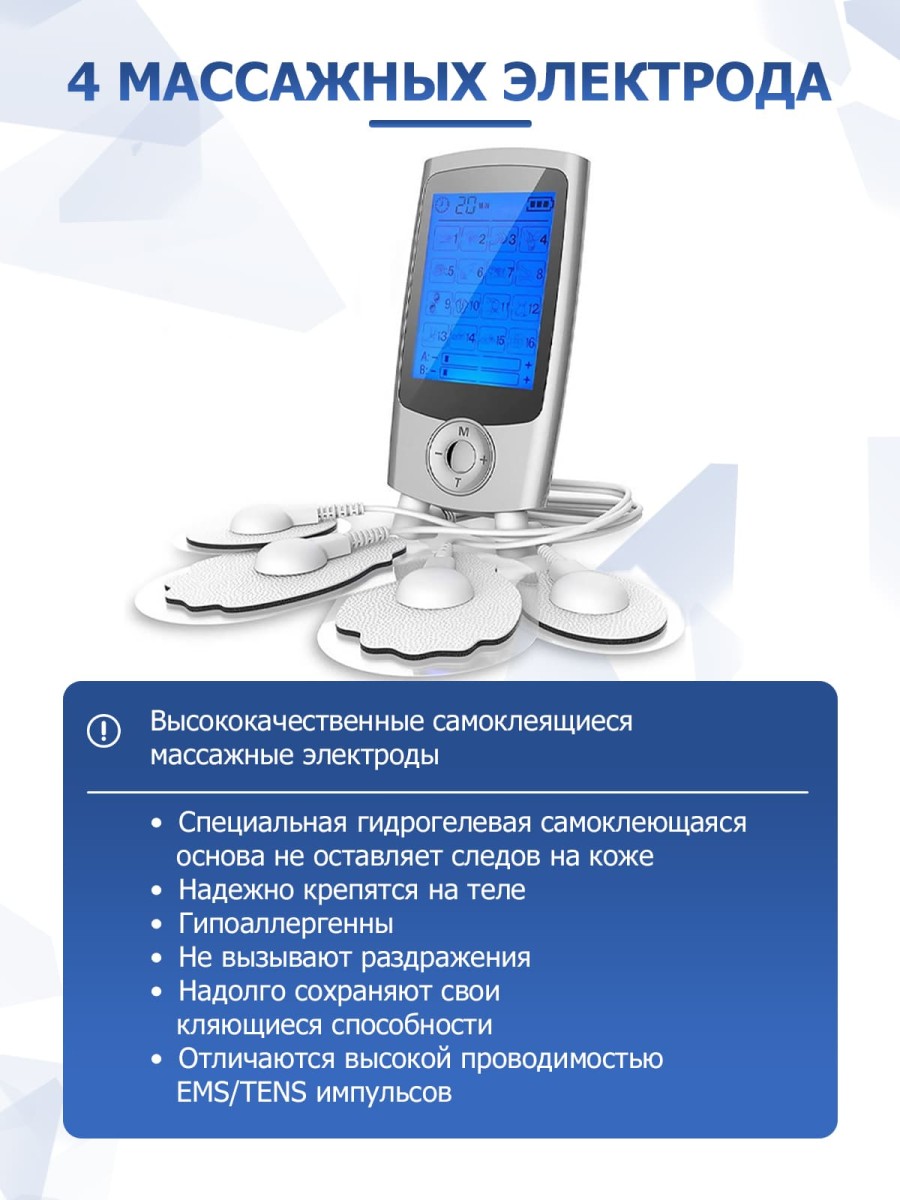 - 4 массажных электрода, подключаемые к каналам, для крепления на теле.