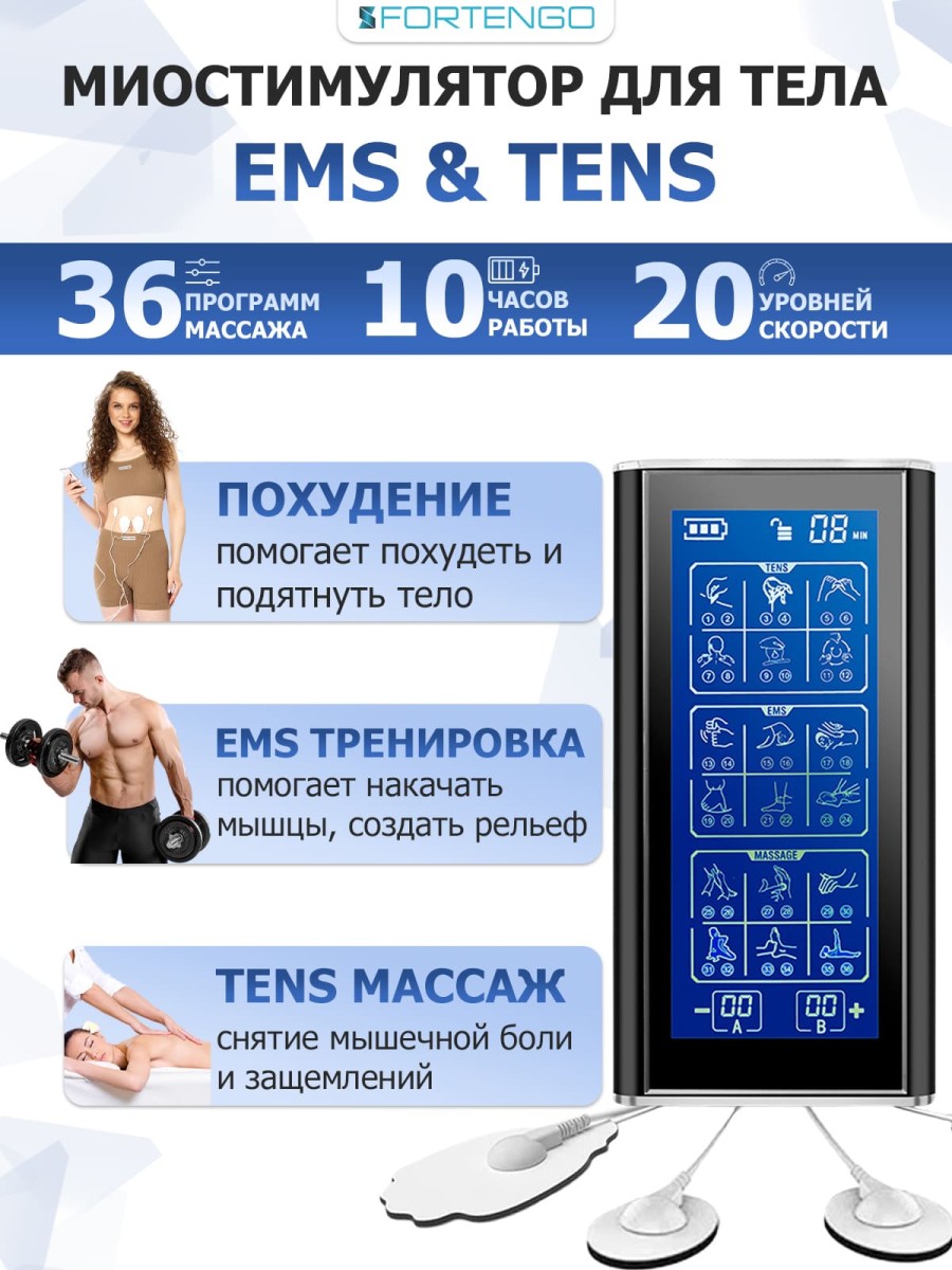 Массажер миостимулятор для тела FORTENGO EMS-450 2 канала, 36 программ, EMS/TENS, черный используется для миостимуляции и массажа тела, для тренировок и похудения с помощью электрических импульсов.