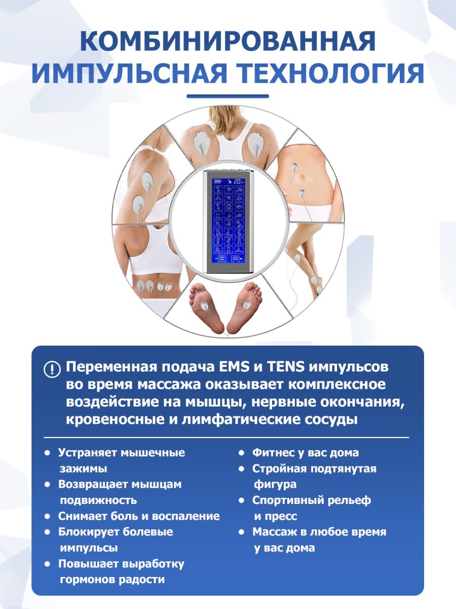 | Дополнительные функции | автоматическое и ручное распределение EMS и TENS импульсов в зависимости от программы |