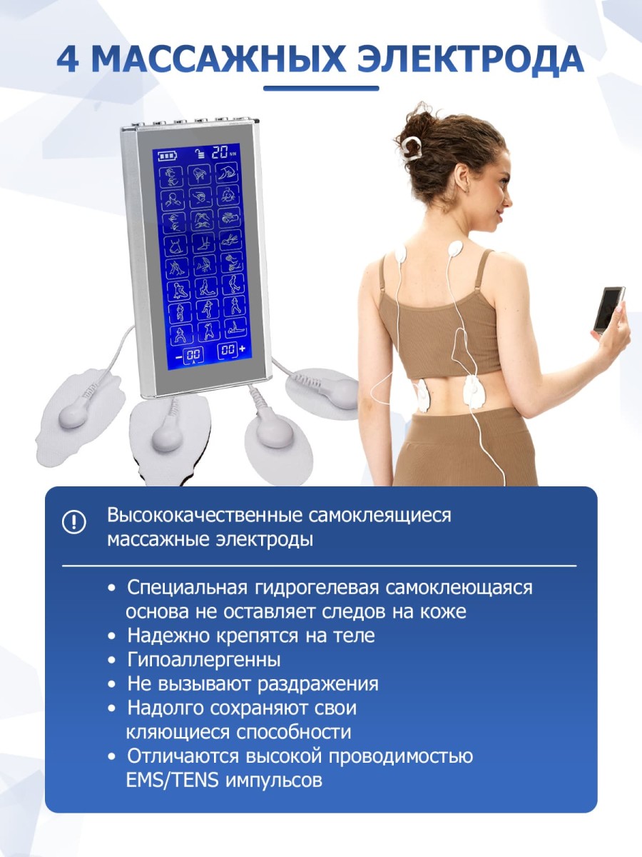 В комплекте идет 4 массажных выносных электрода со съемной защитной пленкой. Перед тем как их поставить необходимо нанести на тело специальный токопроводящий косметический гель.