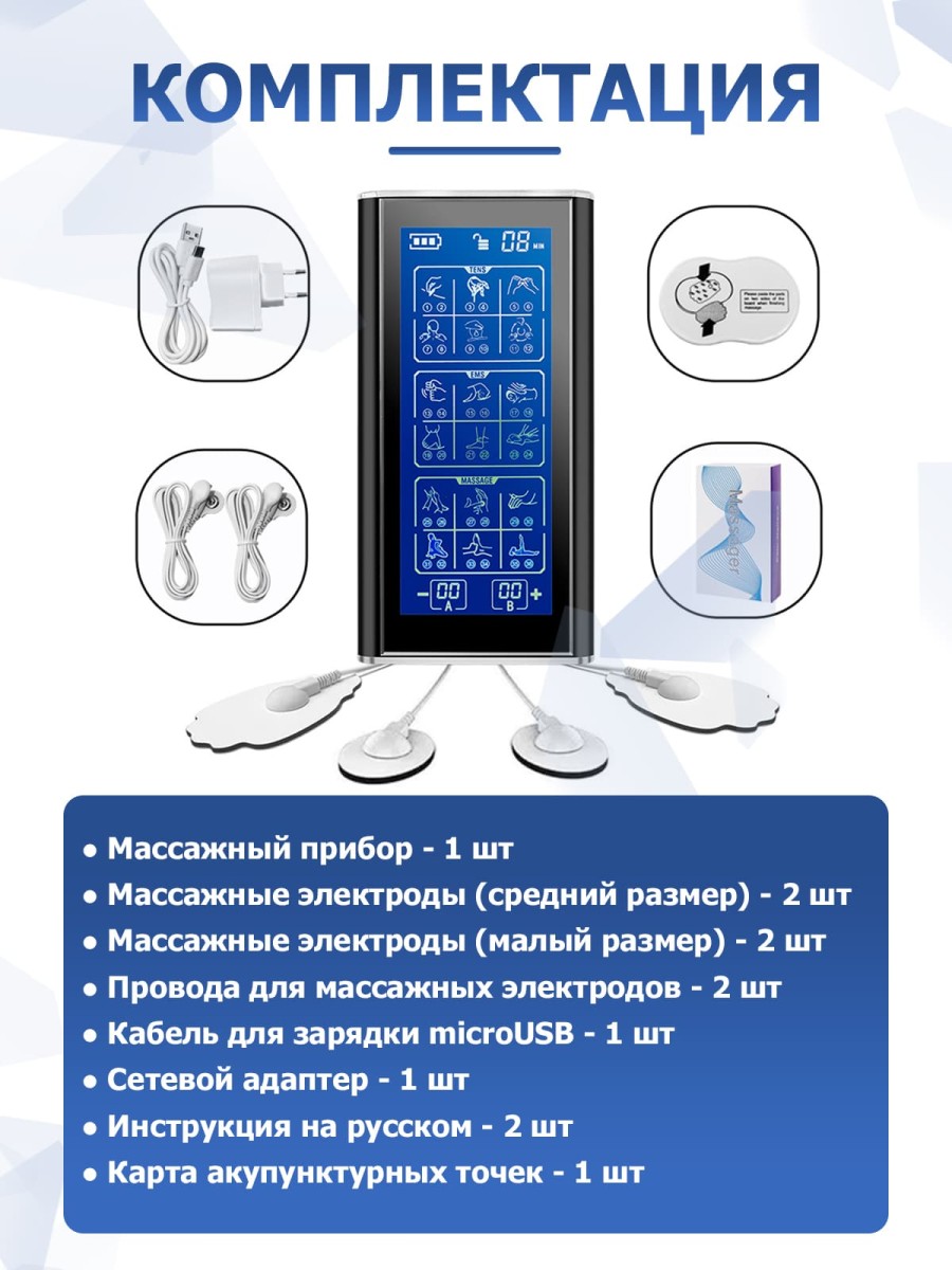 | Комплектация | Массажный прибор, провода для массажных электродов - 2 шт, массажные электроды (средний и малый размер) - 4 шт, сетевой адаптер и кабель для зарядки TYPE-C, инструкция - 2 шт |