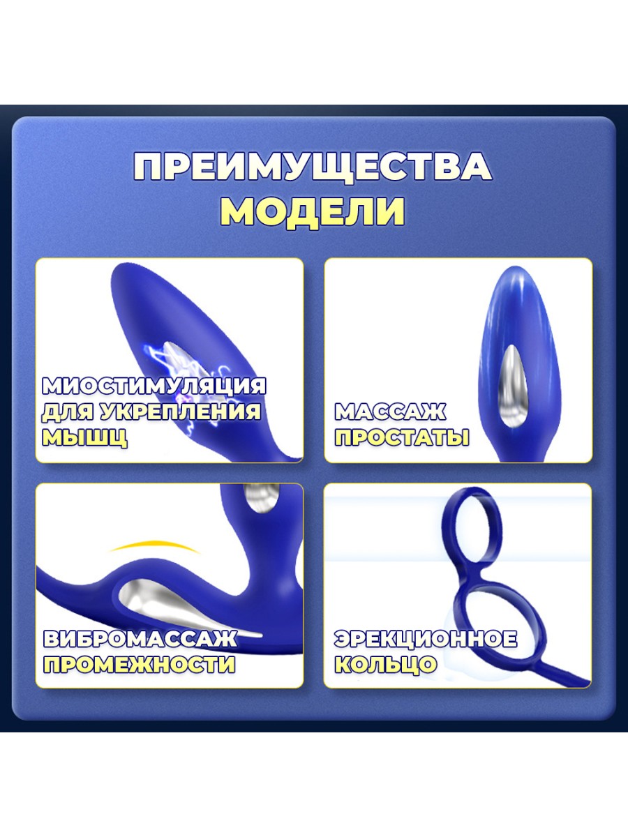 | Вид массажаEMS, вибромассаж, импульсный | Зоны массажапромежности, простата, стенки и мышцы ануса (для мужчин и женщин) | Сфера применениядля дома |