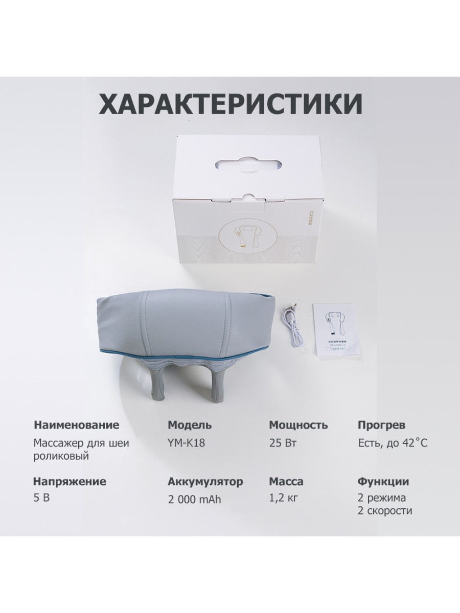 Модель массажера имеет удобную эргономичную U -образную форму в виде воротника с 2 выступающими поперечными и 4 продольными роликами. Управление прибором осуществляется с помощью встроенного кнопочного дисплея на панели устройства.