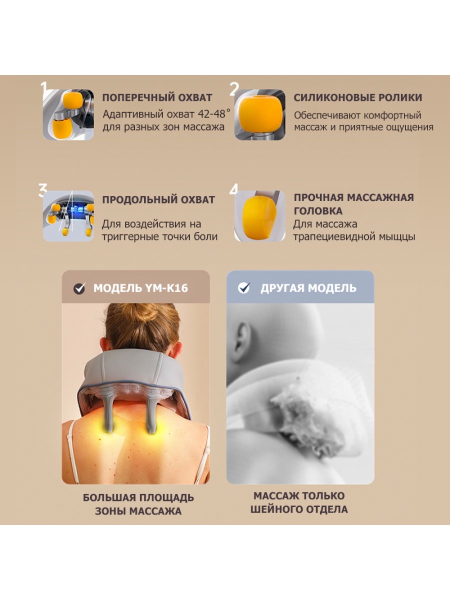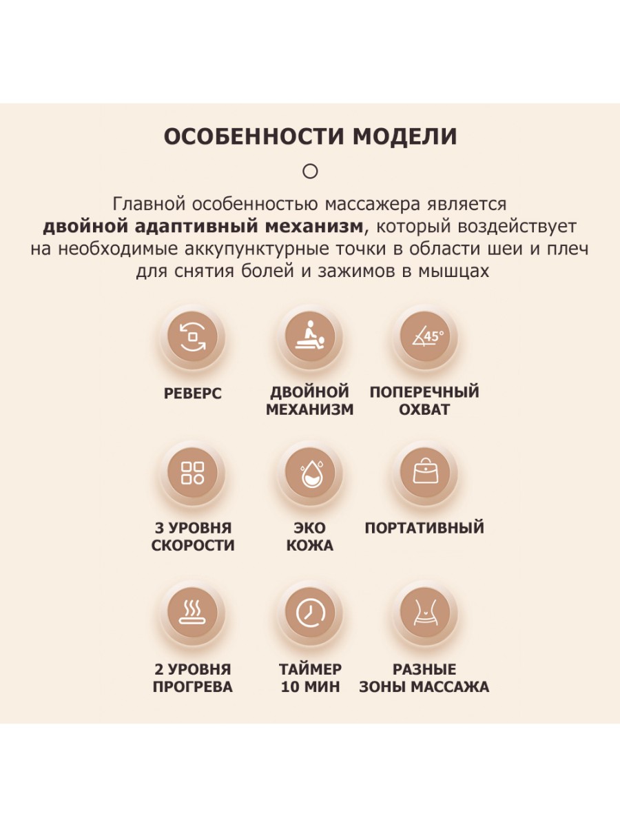 - 6 массажных адаптивных роликов, расположенных по принципу «ромба», обеспечивают большую площадь массажа, тщательную проработку мышечных тканей, болевых уплотнений в трапециевидной мышце и других труднодоступных местах.