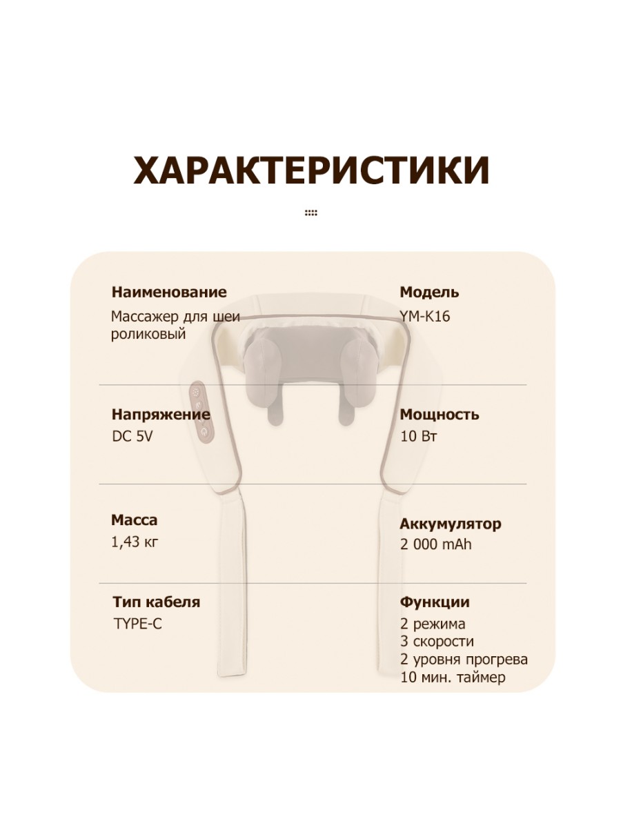 Модель массажера имеет удобную эргономичную U -образную форму в виде воротника с 2 выступающими поперечными и 4 продольными роликами. Управление прибором осуществляется с помощью встроенного кнопочного дисплея на панели устройства.