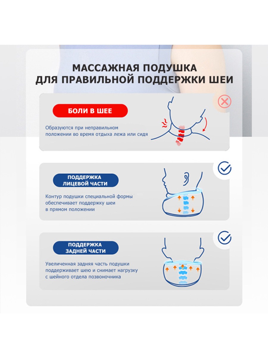 Массажер имеет специальную ортопедическую форму, которая обеспечивает правильную поддержку шеи с 3 сторон: со стороны позвоночника и лицевой части, снимает нагрузку с шейного отдела позвоночника, напряжение и боль с мышц шеи и плеч, помогает восстановить правильный изгиб шеи.