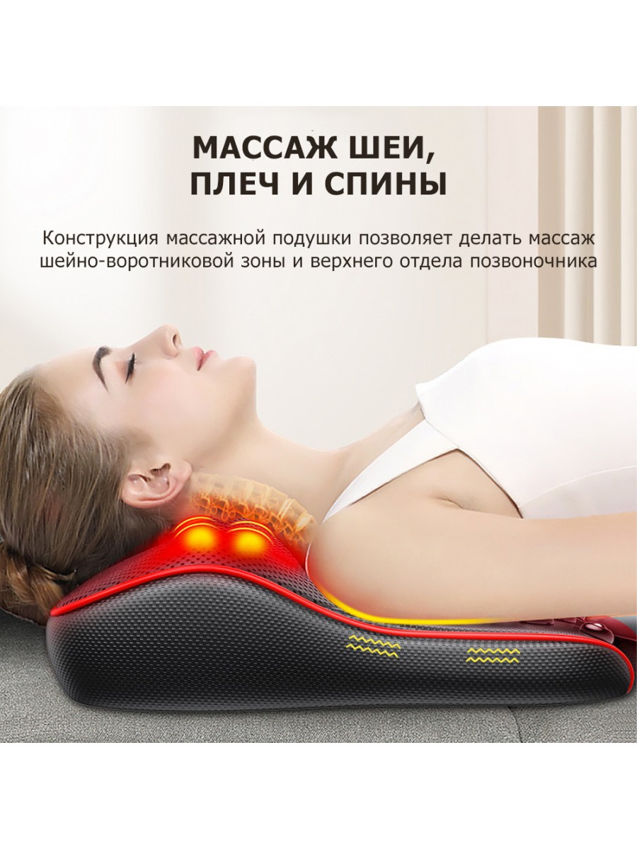 Массажная подушка снимает спазмы с мышц шеи, спины и ног, помогает расслабиться после трудовых будней и восстановиться после тренировок и физических нагрузок.