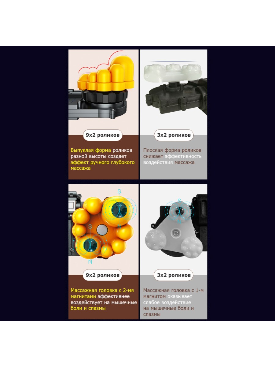 В конструкцию массажера встроены 4 магнита для повышения результативности массажа, снятия боли и защемлений с труднодоступных мышц, восстановления кровообращения.