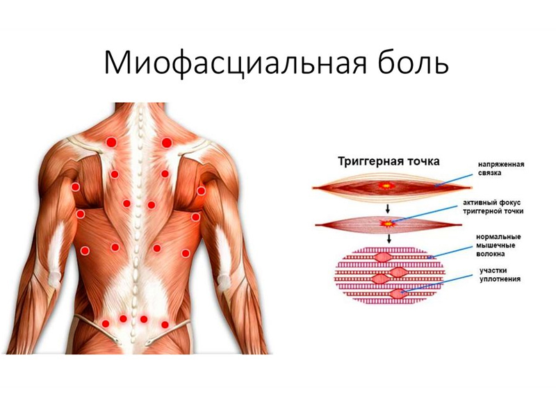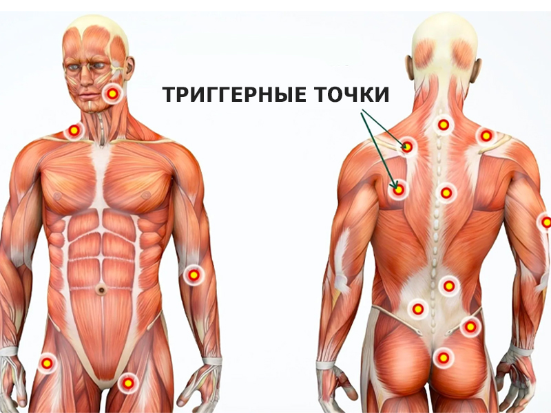 - появление триггерных точек (болезненных уплотнений в мышцах), которые провоцируют иррадиирущую, то есть отраженную боль).
