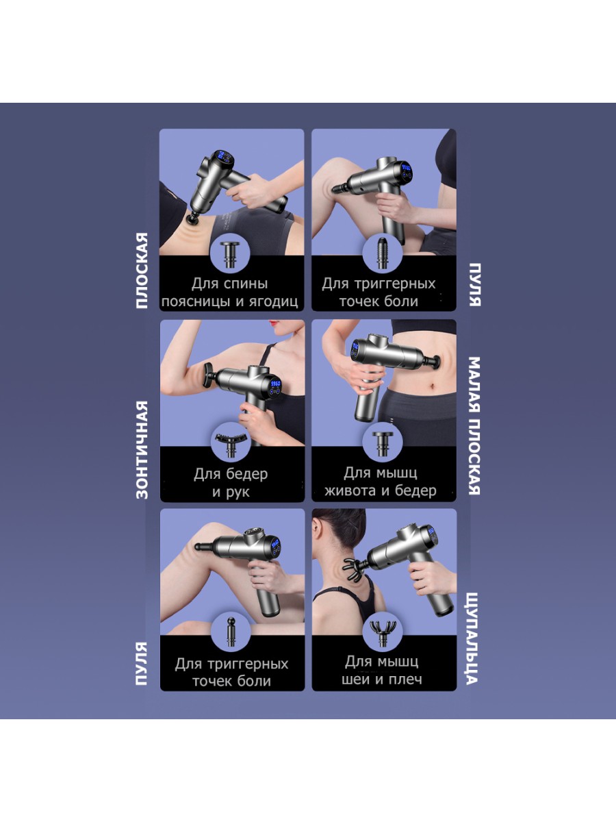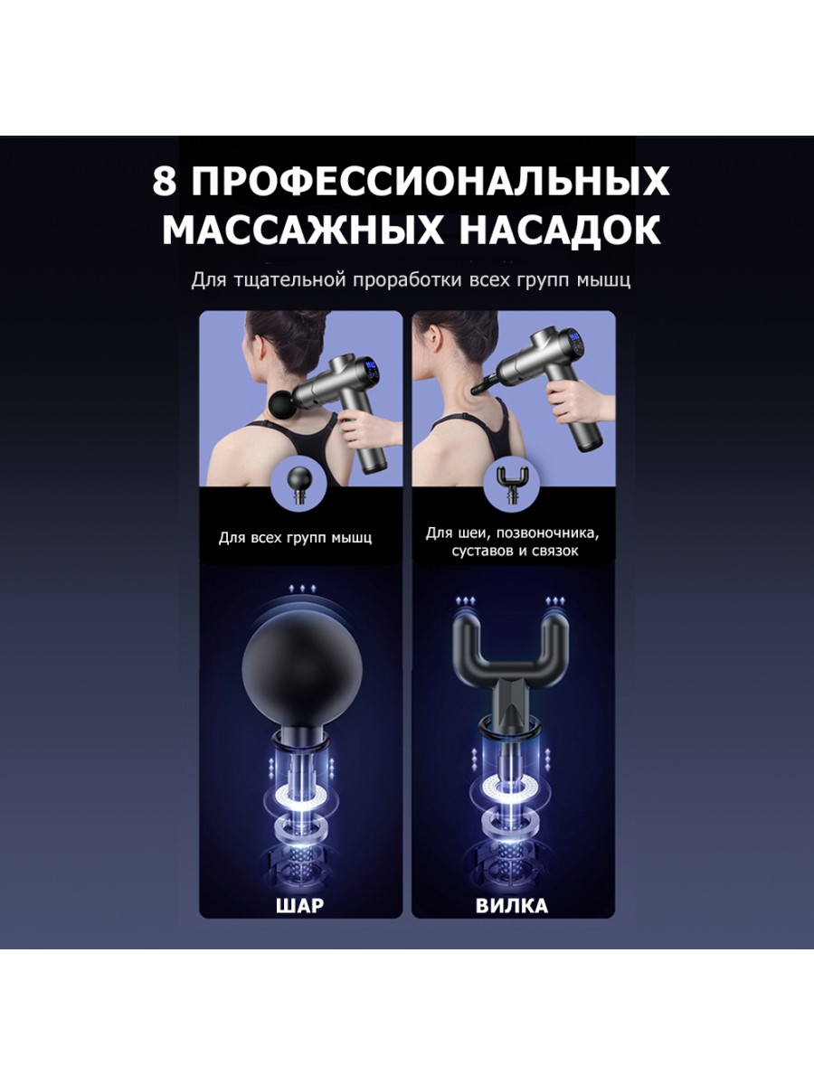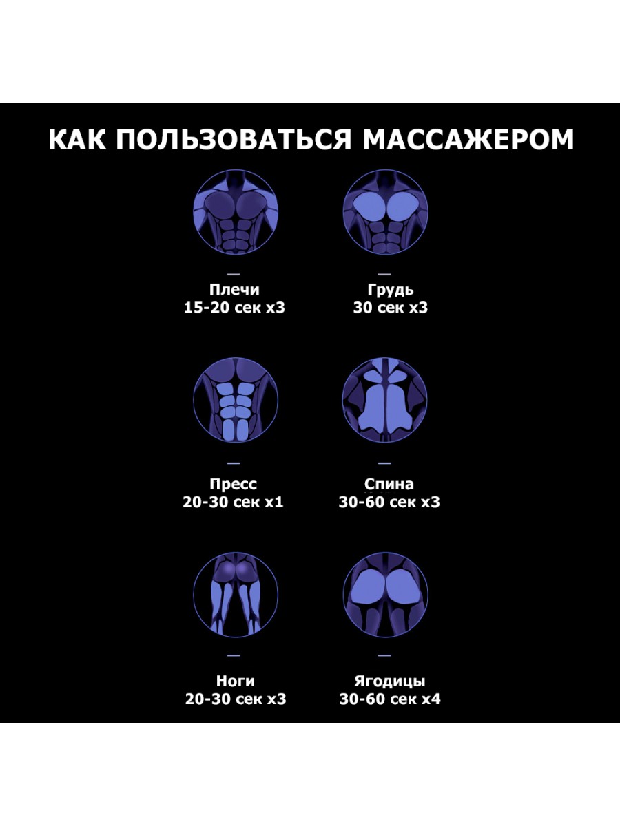 - 8 массажных насадок позволят проработать все проблемные болевые зоны, группы мышц и триггерные точки боли.