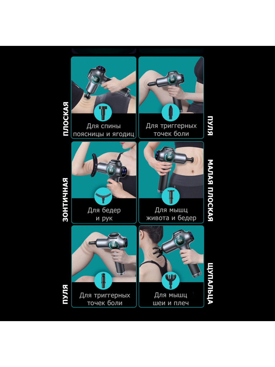 - 8 массажных насадок позволят проработать все проблемные болевые зоны, группы мышц и триггерные точки боли.