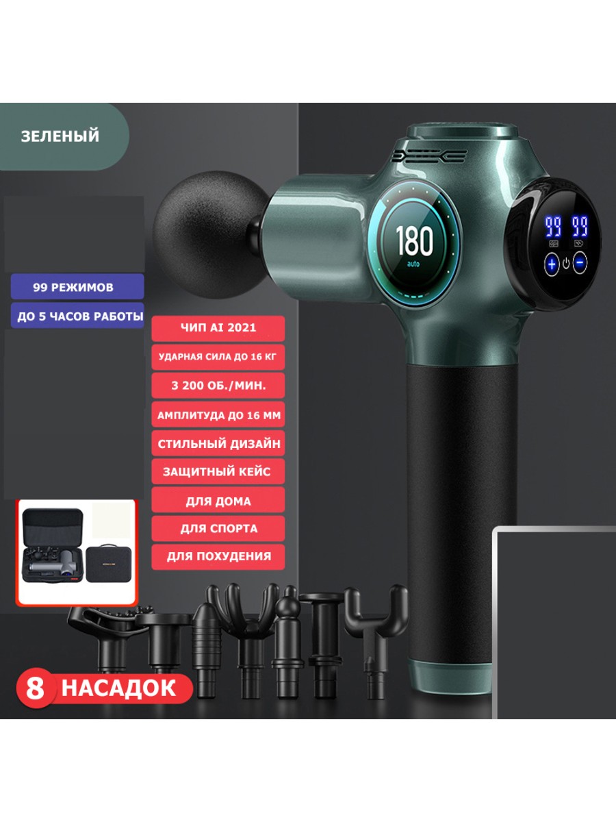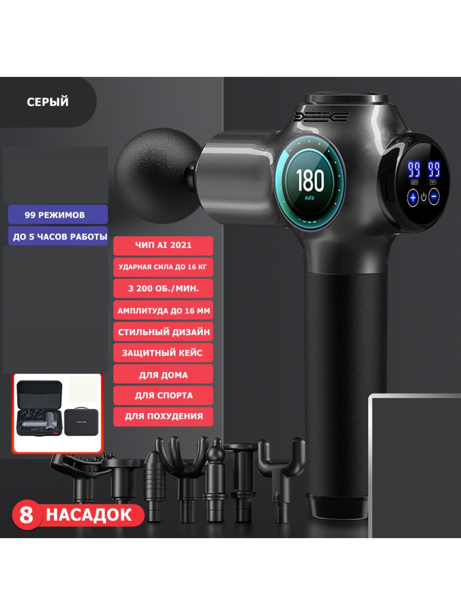 Оснащен новым чипом AI с искусственным интеллектом для оптимального использования энергии, распределения ударной силы и частоты вращения мотора, автоматически подстраивается под условия использования. В комплекте 8 массажных насадок.