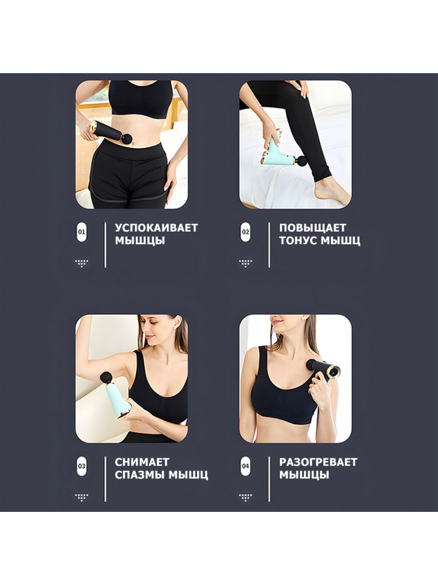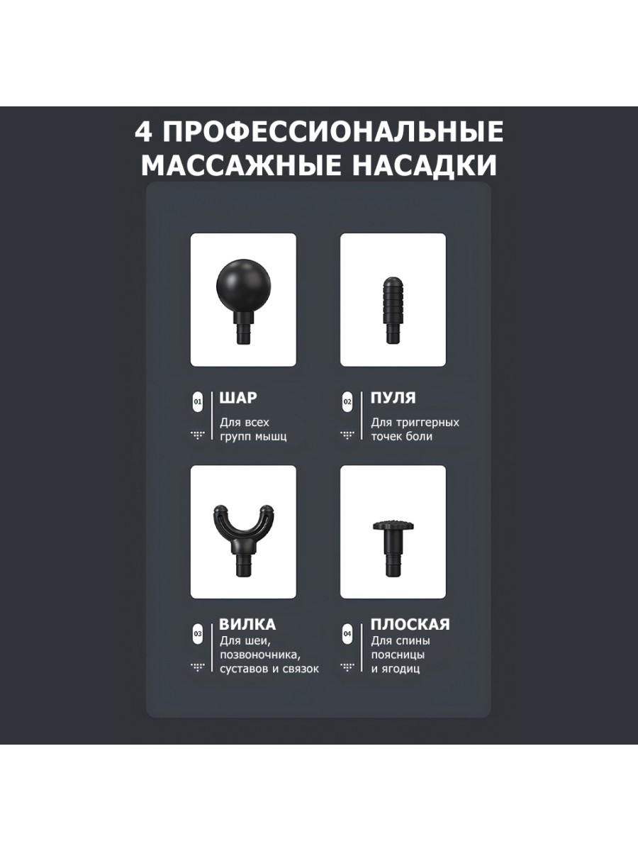 - 4 массажные насадки позволят проработать все проблемные болевые зоны, группы мышц и триггерные точки боли.
