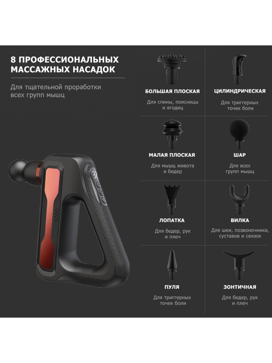 - 8 массажных насадок позволят проработать все проблемные болевые зоны, группы мышц и триггерные точки боли.