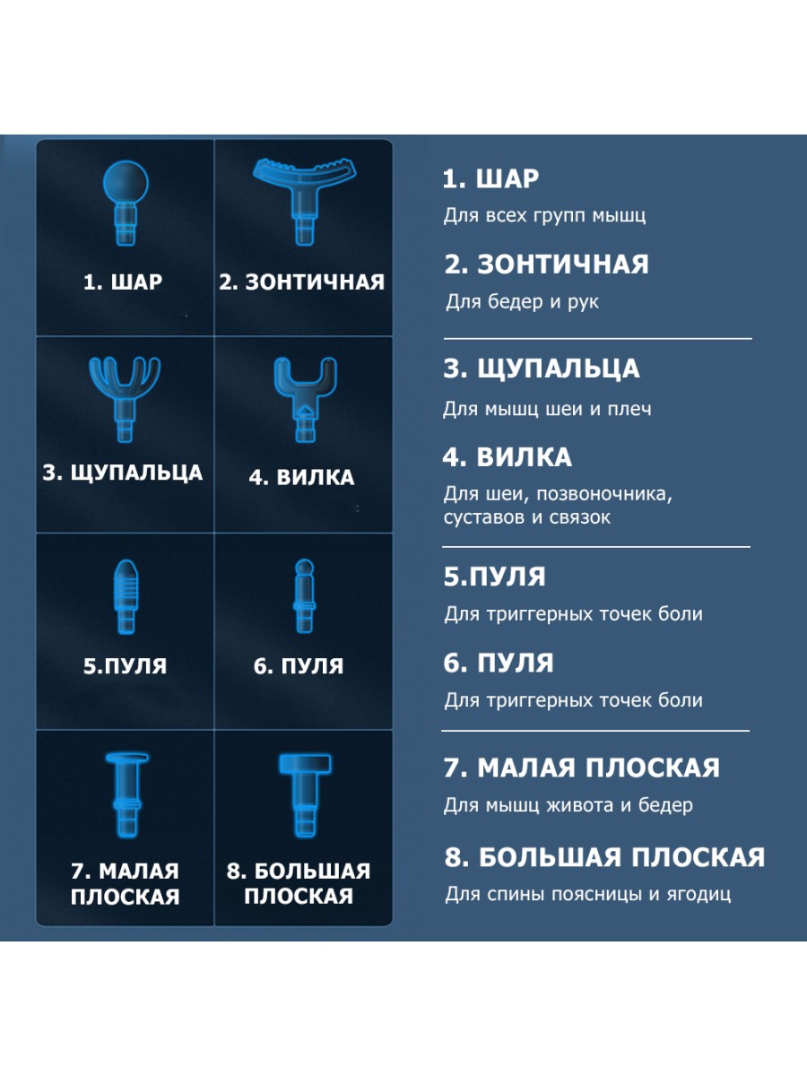 - 8 массажных насадок позволят проработать все проблемные болевые зоны, группы мышц и триггерные точки боли.