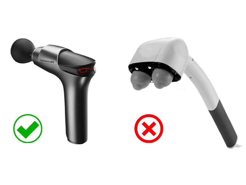 Вибрационная волна во время массажа от электрических массажеров распространяется не направленно в глубь, как у миофасциальных пистолетов, а циркулярным вихрем, то есть распыляется по всей поверхности тела. Поэтому она теряет свою ударную силу, и вибрация от такого массажера не может проникнуть глубоко в ткани, к очагу образования боли. Поэтому с помощью простых электрических вибрационных массажеров разработать триггер или устранить сокращение фасцев и глубоко лежащих мышц очень сложно.