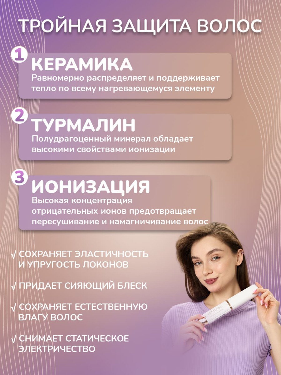 Керамика равномерно распределяет и поддерживает тепло по всему нагревающемуся элементу без повреждения волос. Керамическое покрытие создает идеальное скольжение прядей, не повреждая и не пересушивая, сохраняя их эластичность и упругость, обеспечивая быструю и легкую укладку.