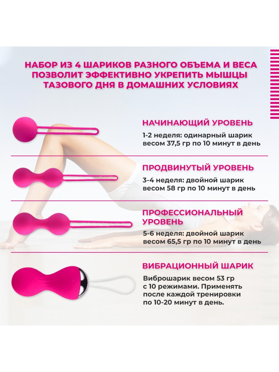 | Комплектация | Шарики – 3 шт (37,5 гр, 58 гр, 65,5 гр), Вибрационный шарик – 1 шт (53 гр), Пульт ДУ, Мешочек для хранения, сетевой адаптер, кабель для зарядки DC, инструкция |